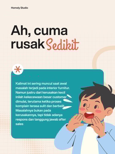 “Ah, cuma rusak sedikit.” Kalimat ini sering muncul saat awal masalah terjadi pada interior furnitur. Namun justru dari kerusakan kecil inilah kekecewaan besar customer dimulai, terutama ketika proses komplain terasa sulit dan berbelit. Masalahnya bukan pada kerusakannya, tapi tidak adanya respons dan tanggung jawab after sales